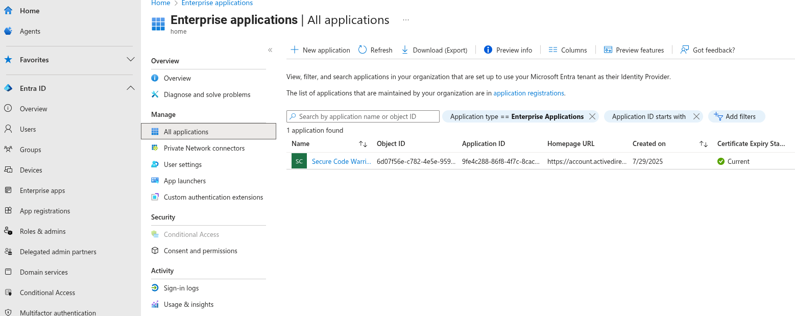 Click "Enterprise apps" in the side navigation bar and select your Secure code application