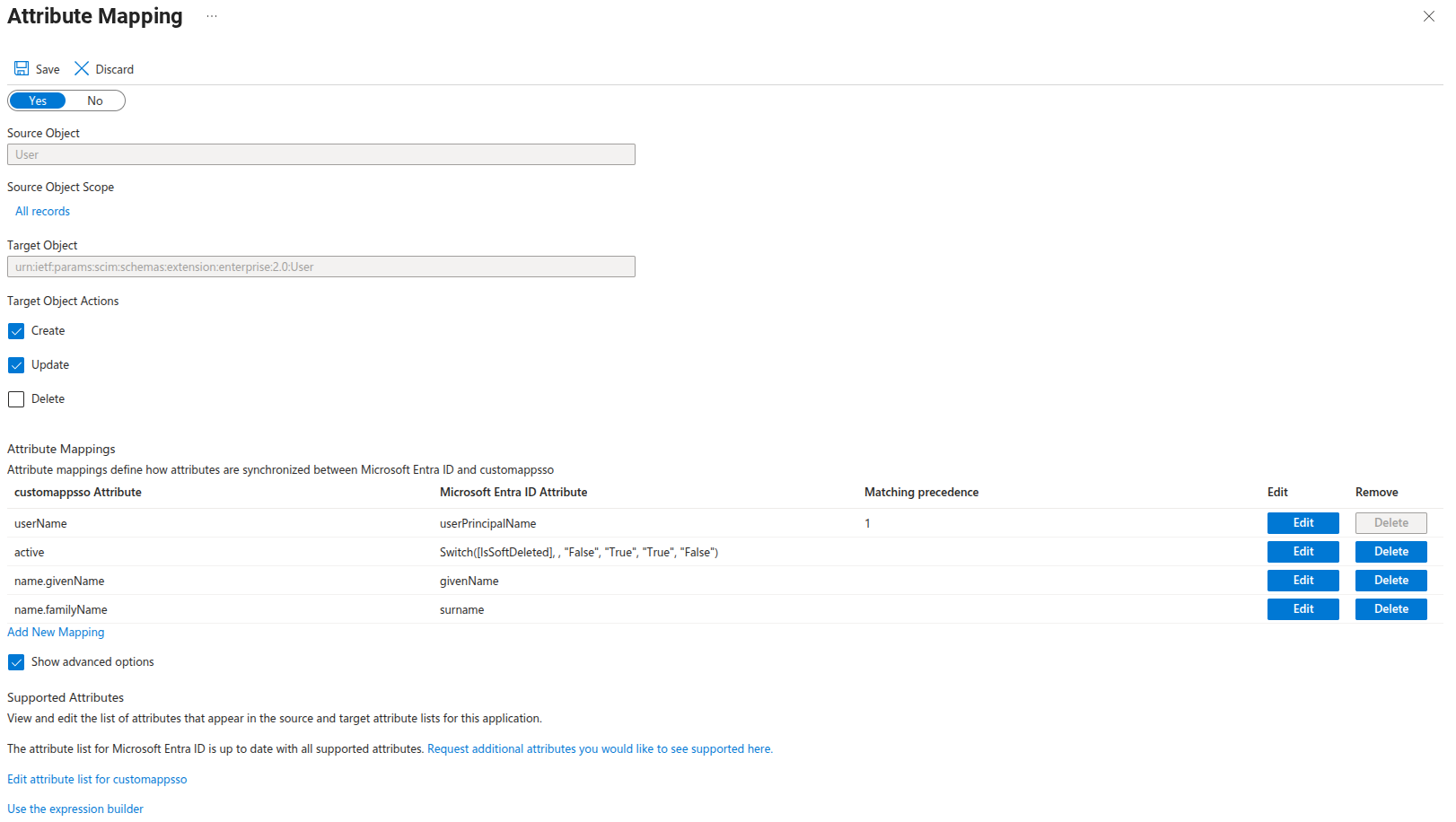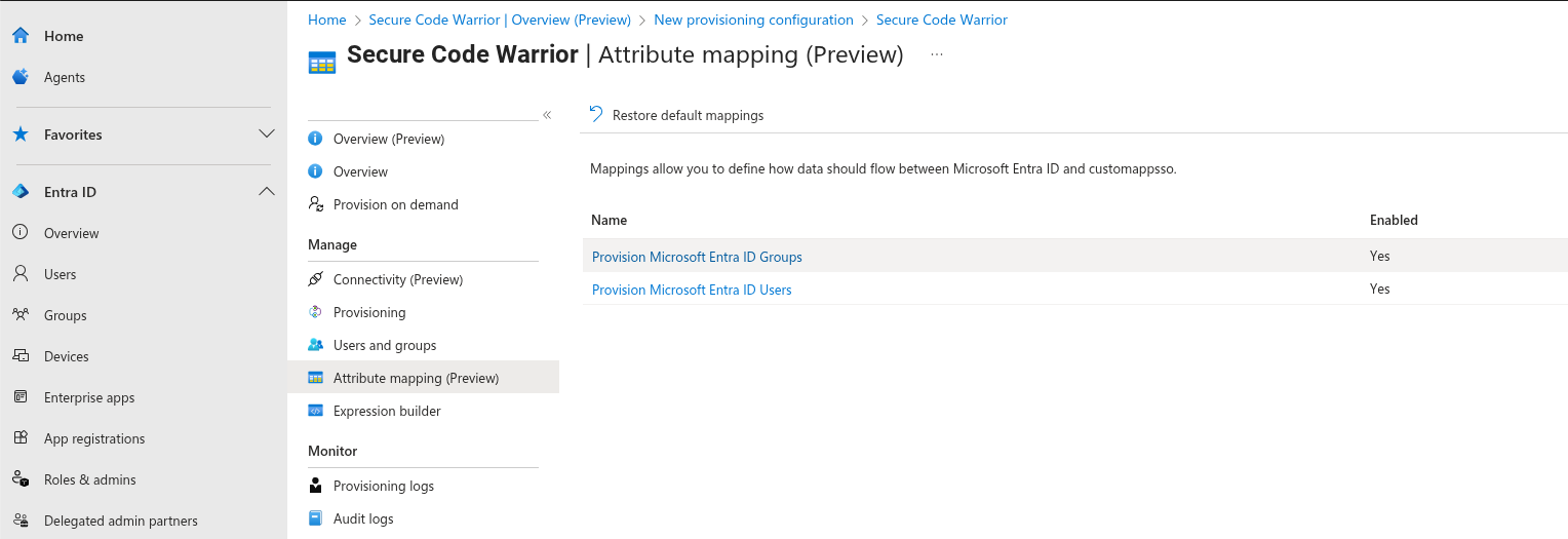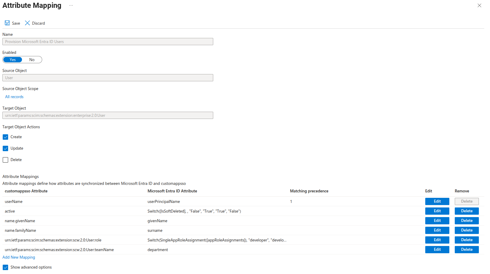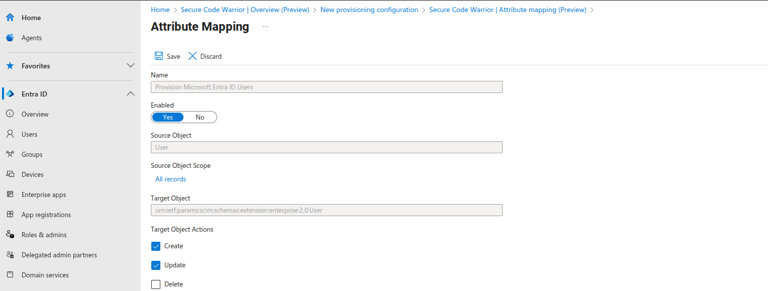 - Navigate back to the attribute mapping for the application ( "Enterprise Apps" > select the SCW App you created > Provisioning > Attribute mapping > Provision Microsoft Entra ID Users).