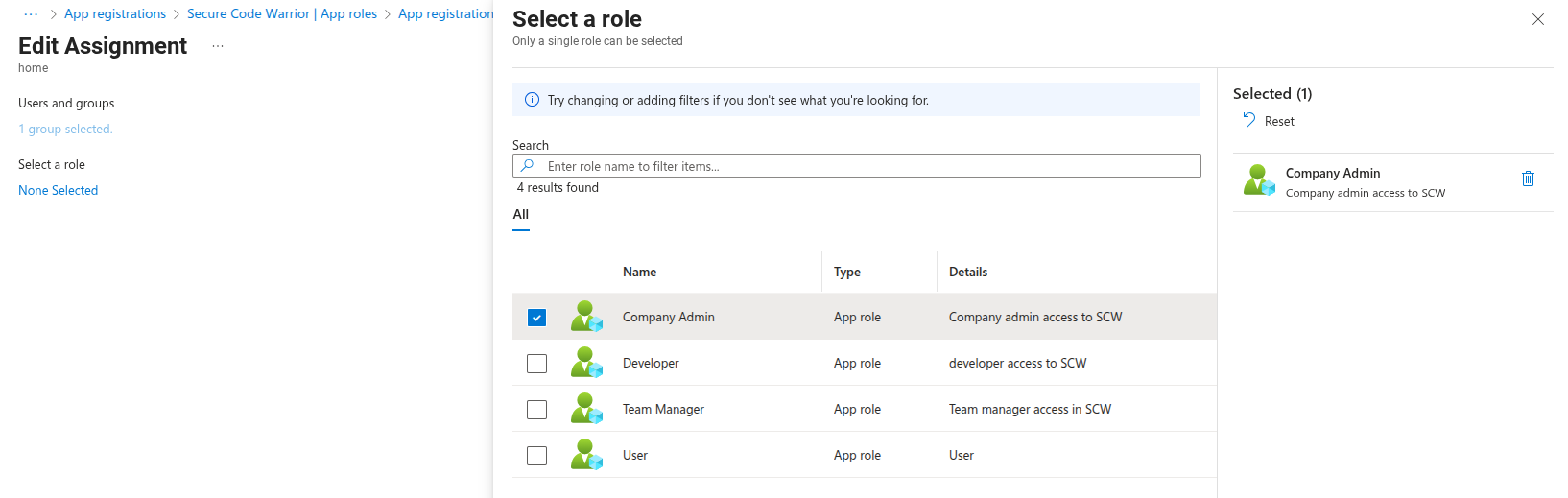 Once the groups are added to the application, assign the appropriate App Role to each group
