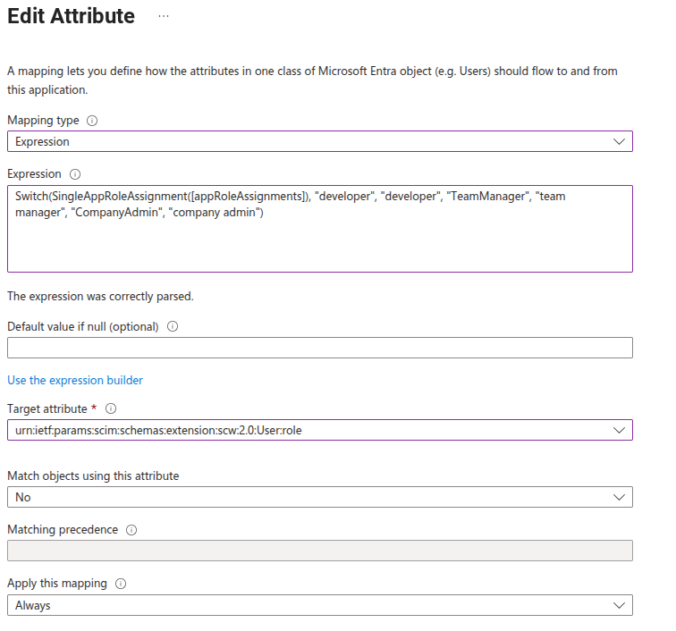 The expression we are using adjusts the value sent by the app roles to match the expected format.