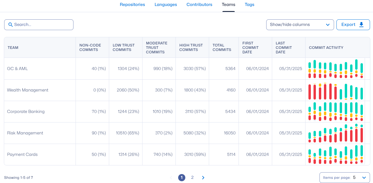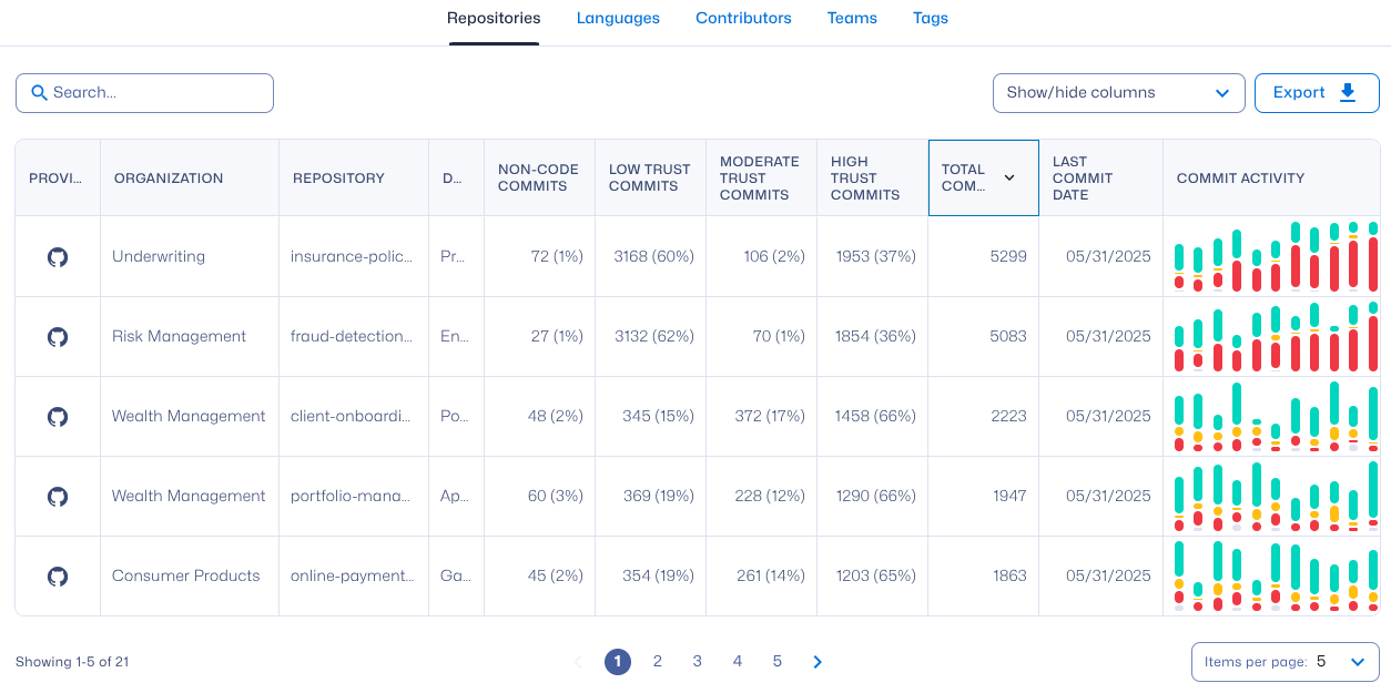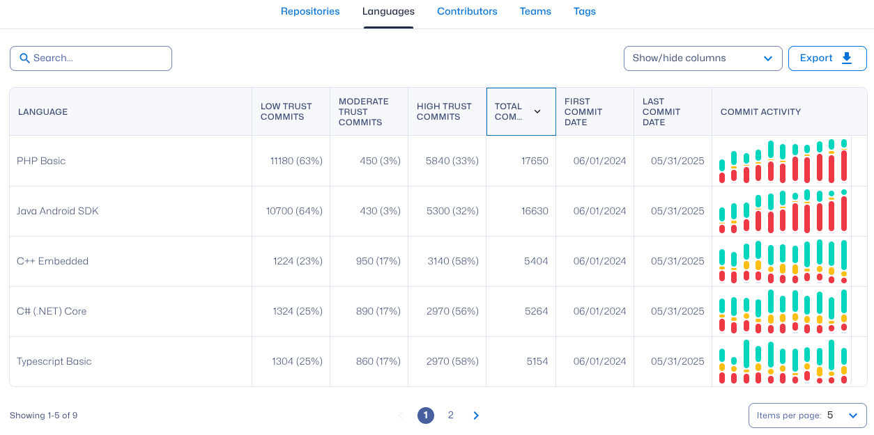 This section provides Trust Agent metrics by programming language. It's often useful to sort this view by the "Commit Activity" or “Total Commits” columns to see which languages are most actively used.