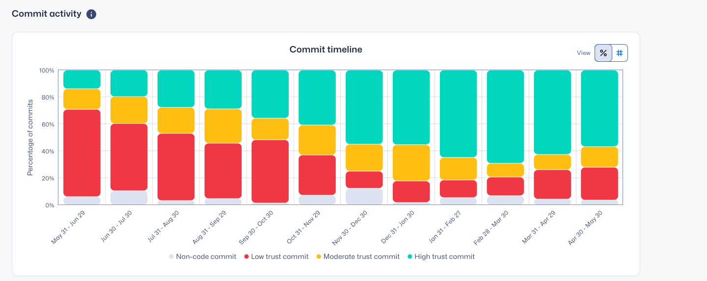 This metric displays a time series chart illustrating your commit activity across four categories: Non-code commits, Low trust commits, Moderate trust commits, and High Trust commits. You can view this data as either a percentage or the actual number of commits, providing a dynamic view of how commit trust levels evolve over time.