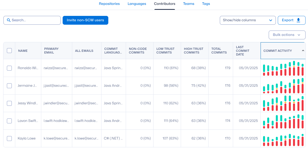 Identify Untrained Users: Use "Invite non-SCW users" to find developers committing code but not on the platform. Get them onboarded to boost overall trust.