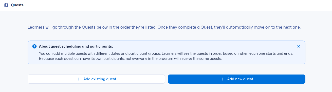 When creating a Quest Program you can now add pre-existing quests to the program. This article will outline how this can be done.