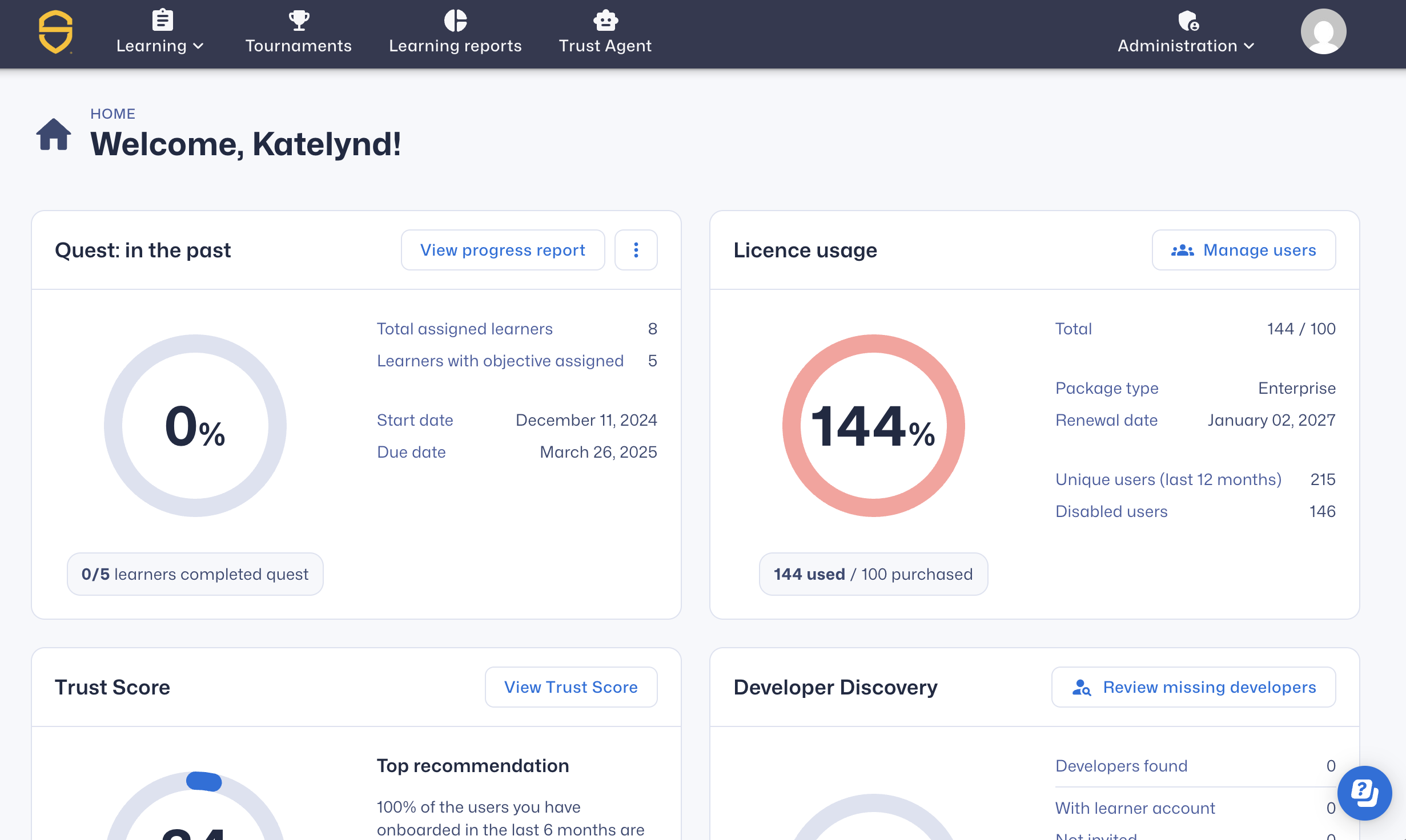- Navigational Changes: A refreshed navigation experience makes it easier to find learning and reporting tools. Learning Reports now sit in the left navigation, and a new Trust Agent entry provides direct access to a dedicated Trust Agent Reports page.