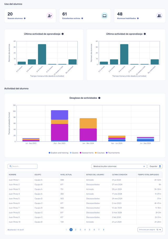 - Última actividad de aprendizaje - Vea qué tan recientemente todos los Alumnos habilitados han completado su última actividad de aprendizaje.