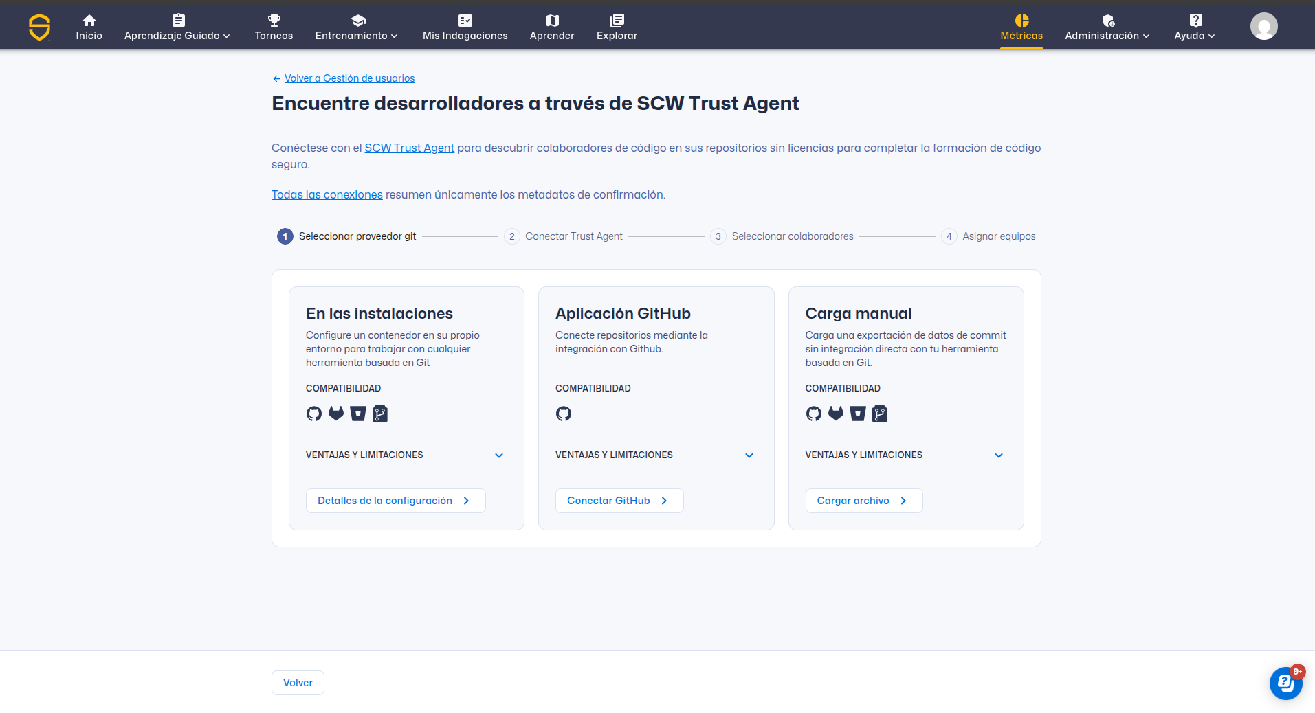 Si Trust Agent: Commits aún no se ha configurado, se le pedirá que seleccione un proveedor y se conecte. Seleccione su método de conexión preferido y siga esta guía en Cómo conectar Trust Agent: Commits a su herramienta de gestión de código fuente.