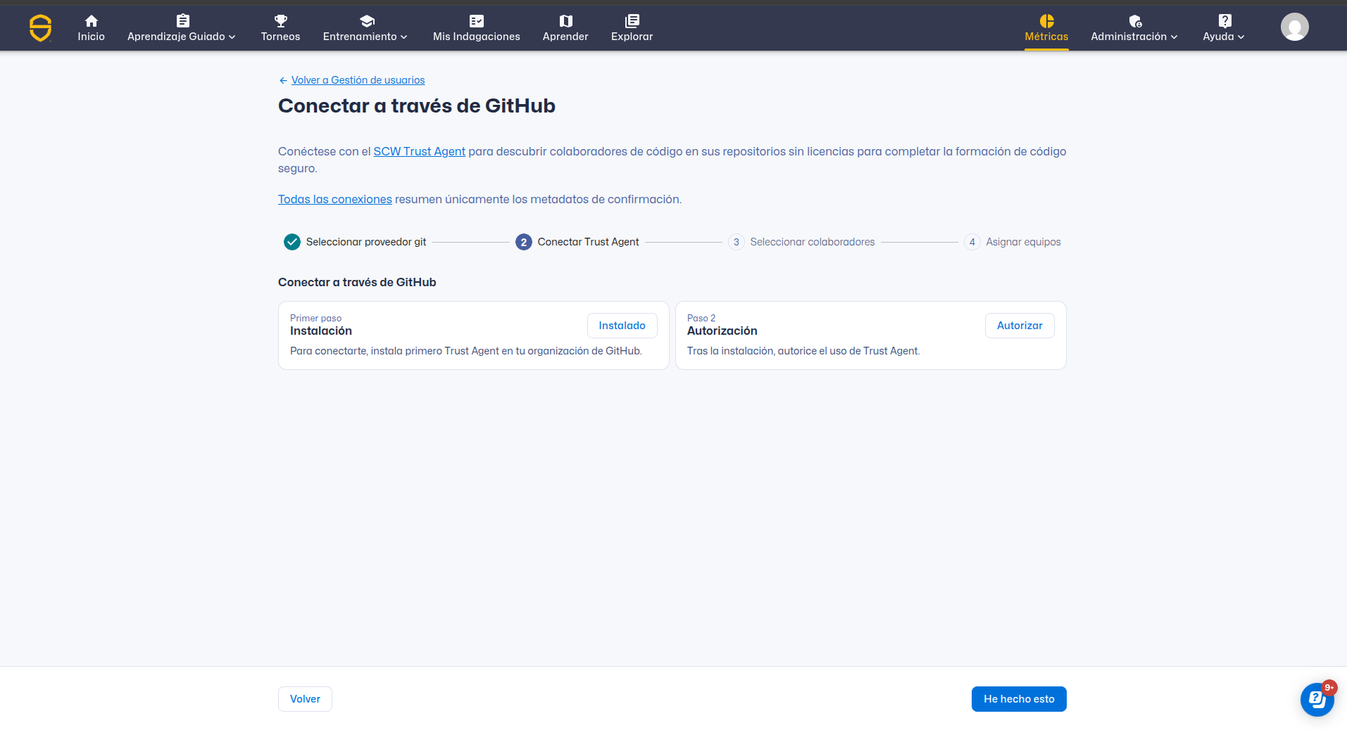 En este ejemplo, hemos hecho clic en Conectar GitHub para seleccionar la aplicación GitHub como método de conexión y se nos pedirá que instalemos y autoricemos la aplicación. Una vez completados estos pasos, haga clic en I've done this.