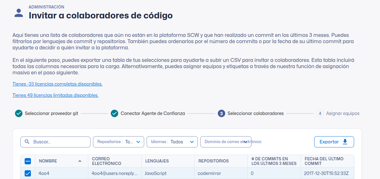 Una vez que Trust Agent: Commits se ha conectado y los datos de commit se han importado correctamente, verás una lista de contribuidores de código que han realizado commits pero que no están presentes en la plataforma de aprendizaje de SCW. Puedes revisar los lenguajes en los que escriben código, los repositorios en los que trabajan, el número de commits que han realizado en los últimos tres meses y su última fecha de commit para ayudarte a decidir si estos contribuidores deberían incluirse en tu programa de formación sobre seguridad de aplicaciones. Puede utilizar la barra de búsqueda y los filtros para reducir la lista, así como exportar toda la lista a CSV para un análisis más avanzado. Una vez que haya hecho su selección de colaboradores en la tabla, haga clic en Siguiente.