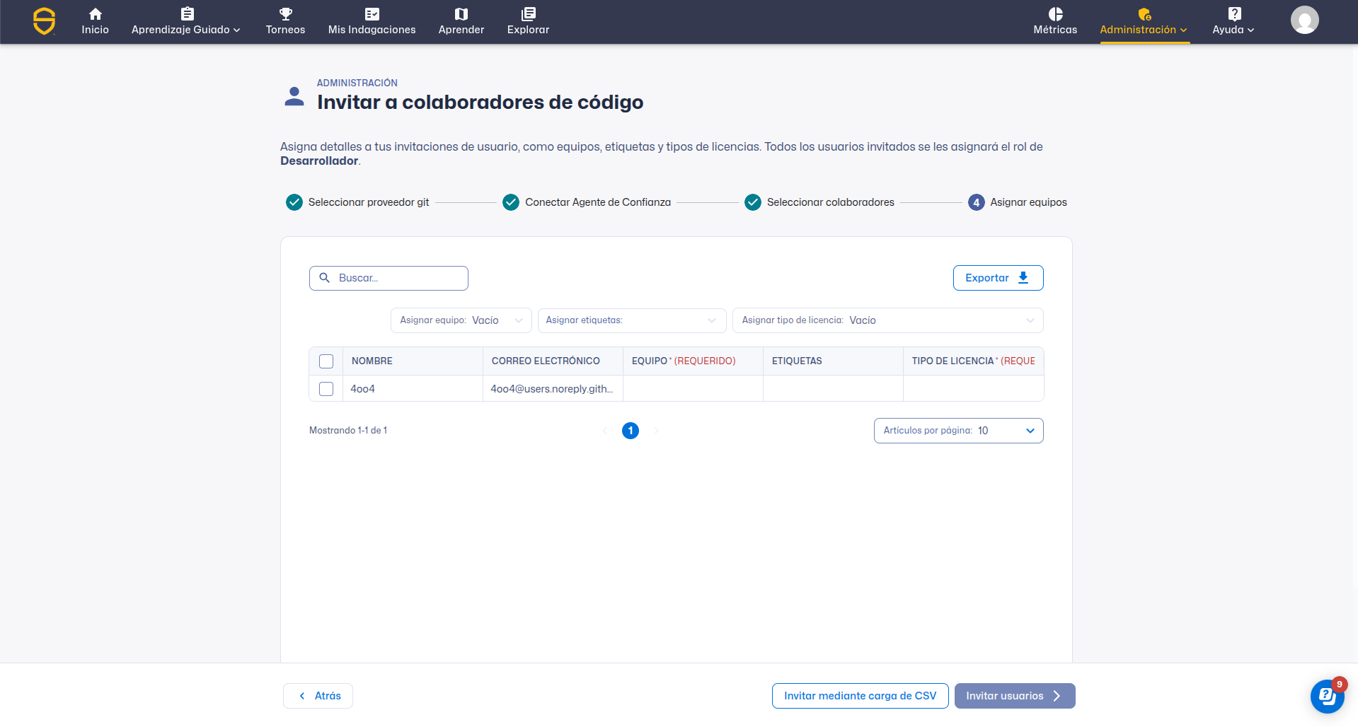 En la siguiente pantalla verá la lista de colaboradores que seleccionó en el paso anterior y podrá asignar equipos y etiquetas en bloque. Una vez rellenados todos los campos requeridos, simplemente pulse Invitar usuarios para añadirlos a la plataforma de aprendizaje SCW.
