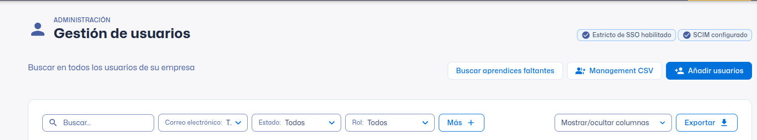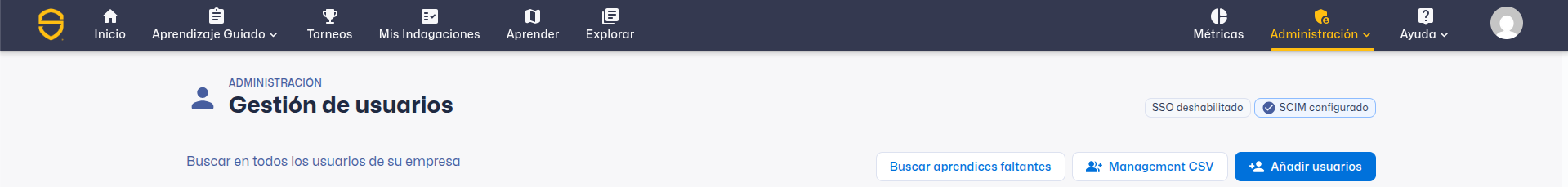 Los administradores de la empresa pueden iniciar Developer Discovery haciendo clic en Find missing learners en la pantalla User management .