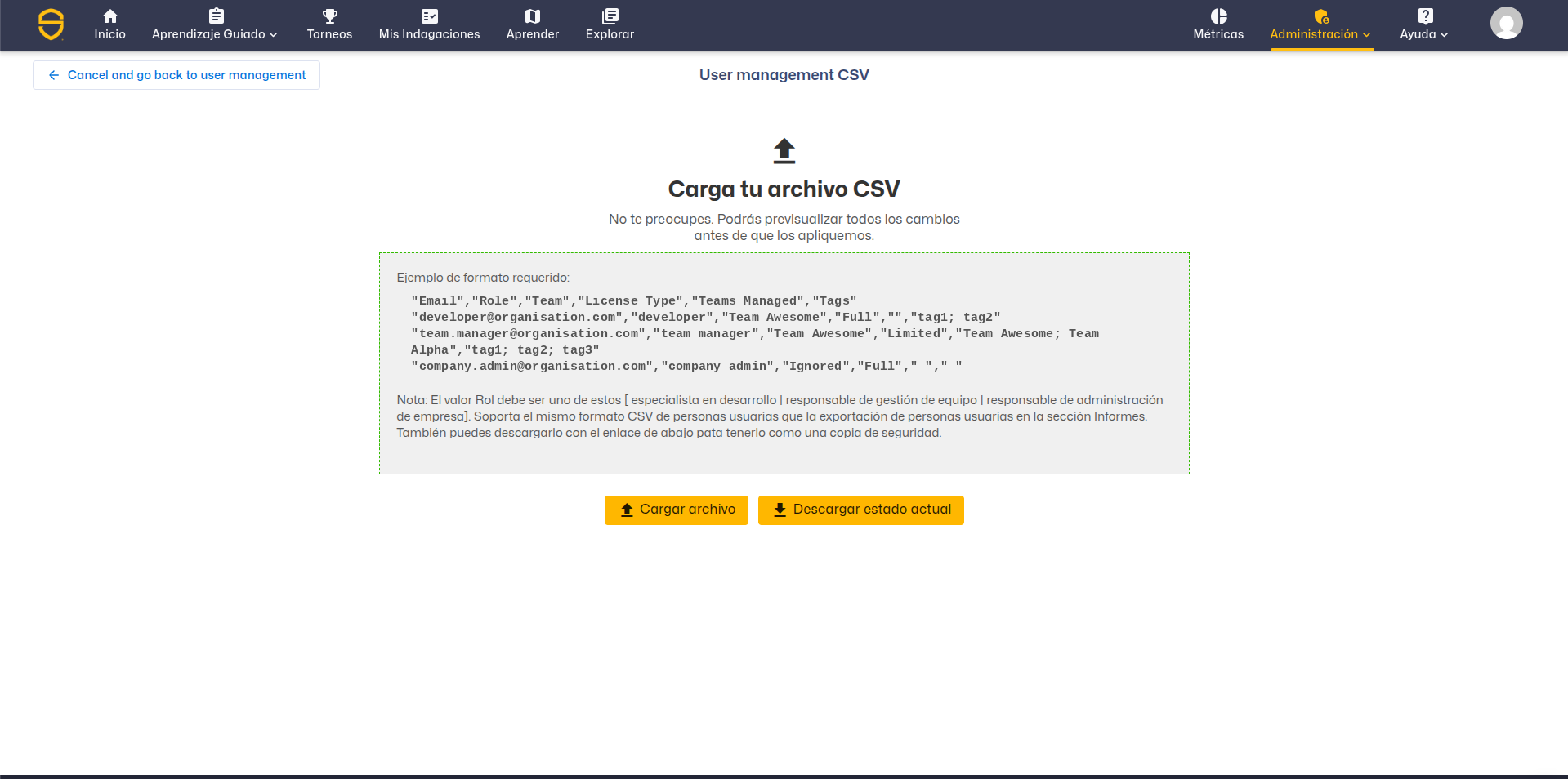 Cargue aquí su CSV para invitar a los alumnos que faltan y que ha identificado. Podrá ver una vista previa de los cambios antes de iniciar la invitación masiva. Para obtener información más detallada sobre este paso, consulte este artículo en Cómo importar usuarios de forma masiva.