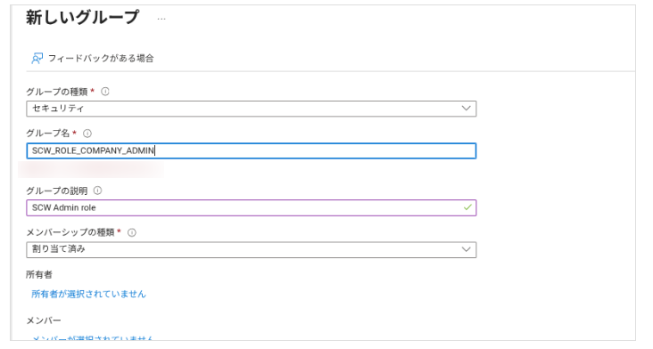 - グループの名前を入力します。次のスクリーンショットは、SCW_ROLE_COMPANY_ADMIN ロールのグループを作成する方法を示しています