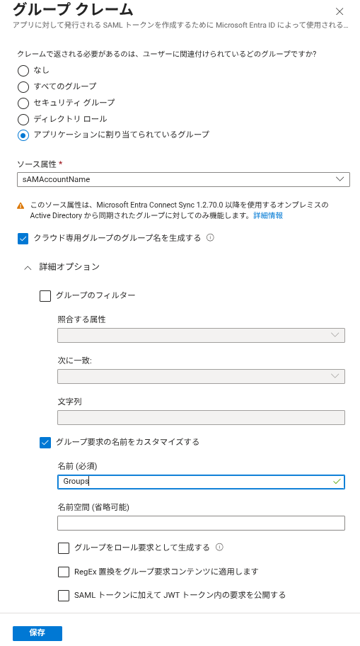 - 下 "詳細オプション"の場合、"グループ要求の名前をカスタマイズする" オプションを設定し、名前" から グループ