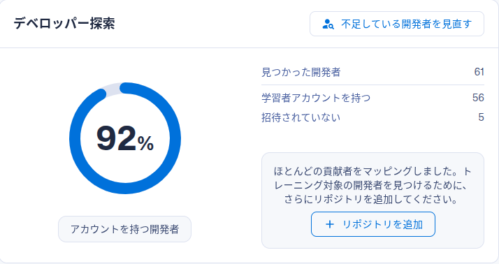 Trust Agent 経由でアップロードされたリポジトリにコミットしているプラットフォーム内の開発者の数の概要を提供します。