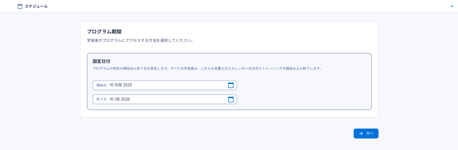 プログラム期間を選択します。プログラムの具体的な開始日と終了日を設定します。すべての受講者は、これらの日付内にトレーニングを開始および終了します。