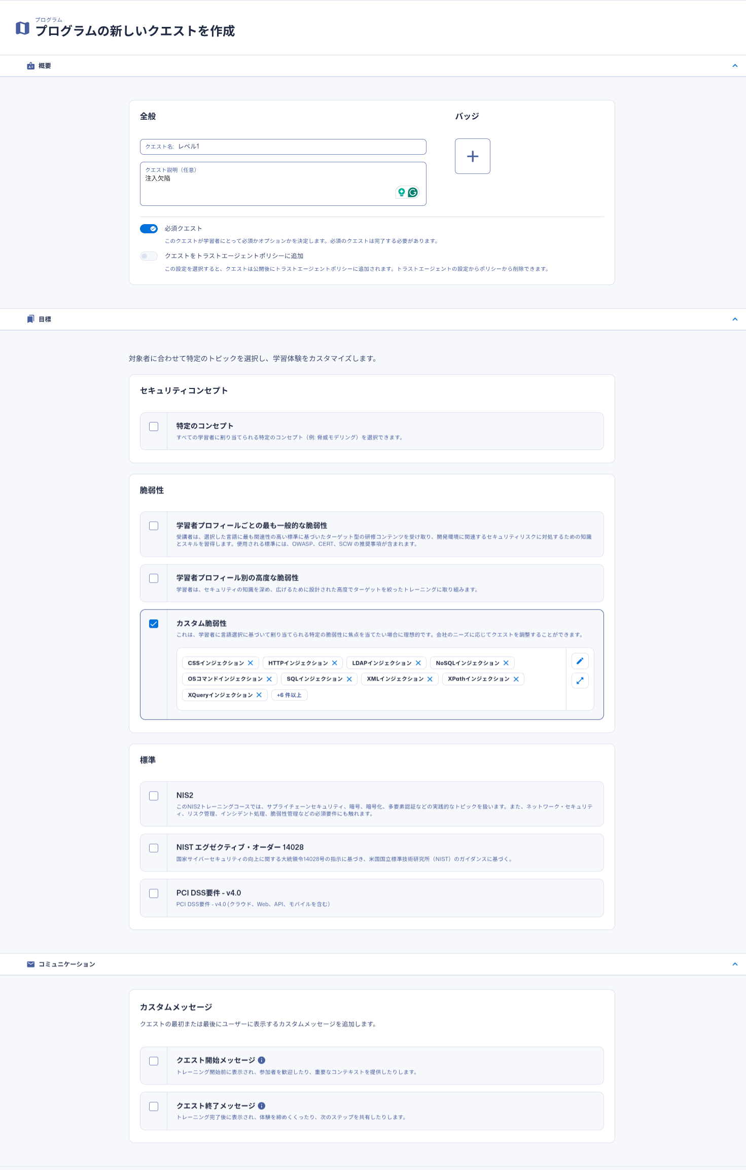 注: 現在、管理者はプログラムの作成時に新しいクエストを作成することしかできません。既存のクエストを選択する機能はまもなく利用可能になります。