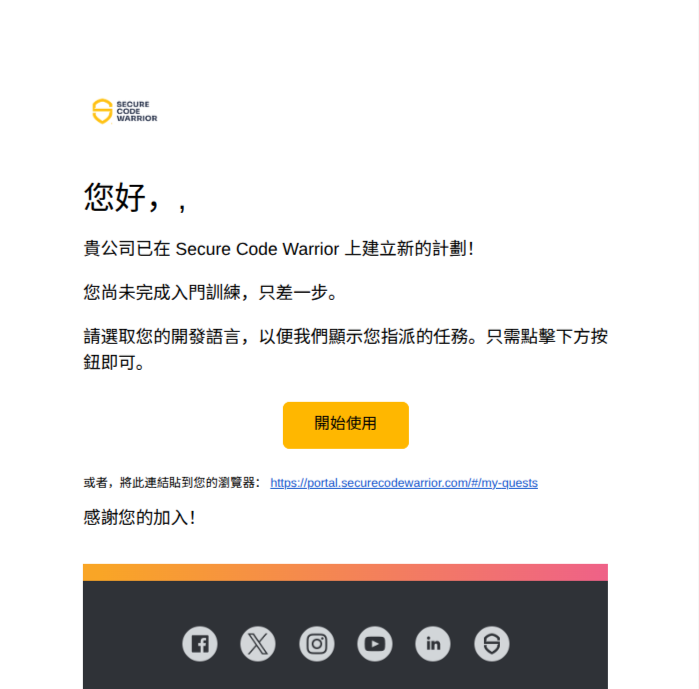 まだ言語を選択していないユーザー - には、「Secure Code Warrior で開発言語を選択してください」という件名のメールが届きます。
