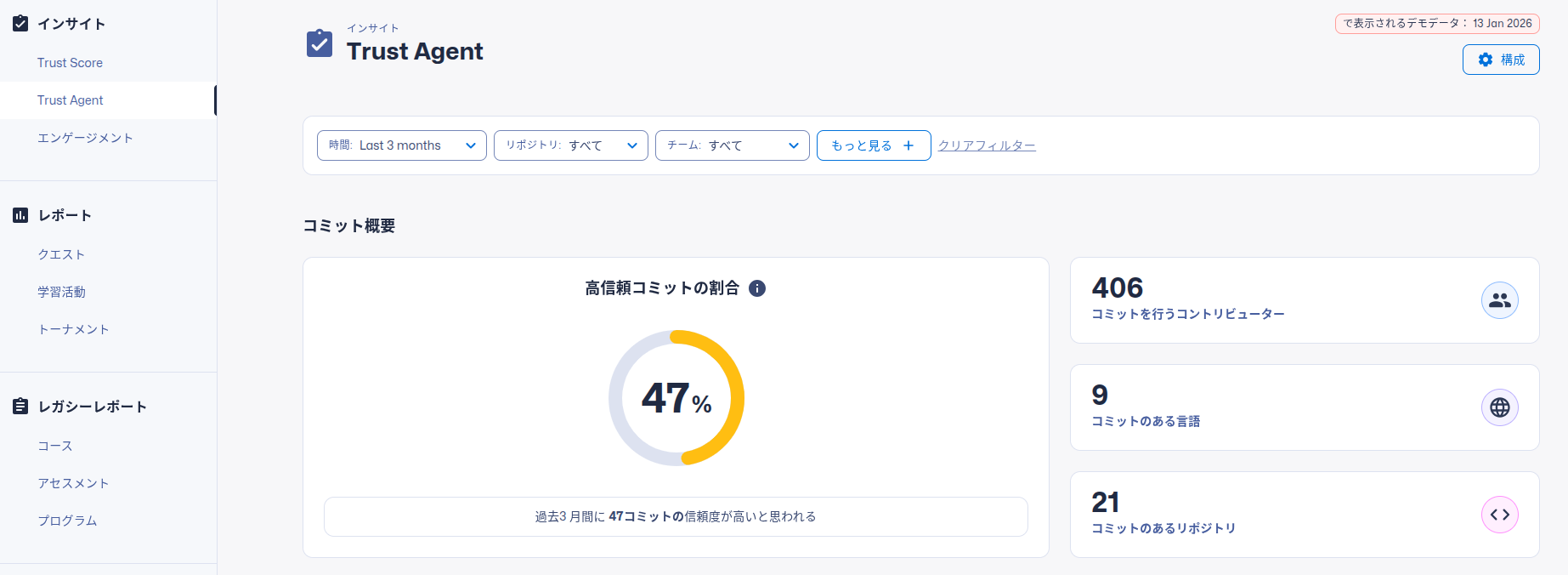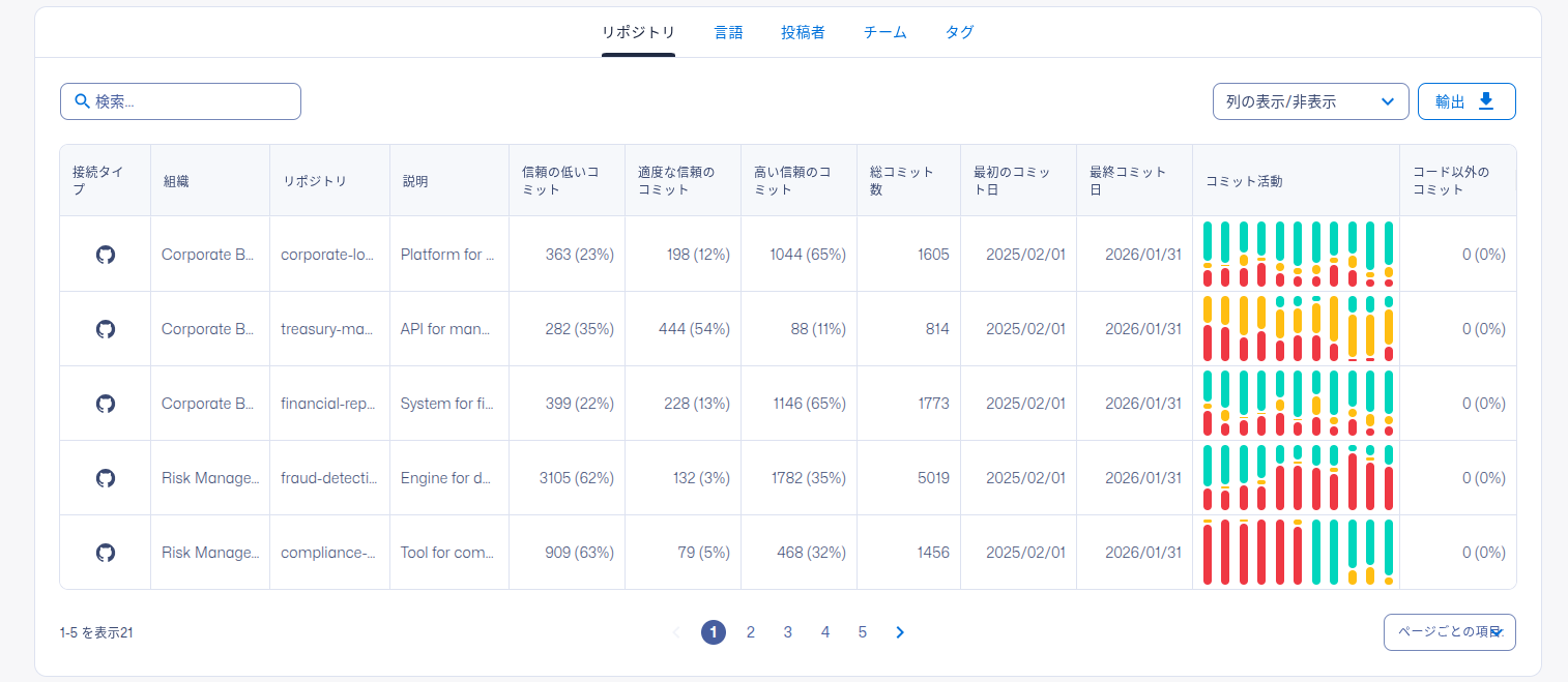 このセクションでは、リポジトリ別の Trust Agent メトリクスを示します。すべてのリポジトリに精通しているわけではありませんが、エンジニアリングやセキュリティのリーダーは、通常、組織の重要なリポジトリを特定することができます。スキャナから)既知の脆弱性がある重要なレポ ティの低信頼コミットの割合が高い場合、大幅な手直しと開発者のトレーニングが必要であることが明らかであり、このデー タは強力なビジネスケースを構築するのに役立ちます。