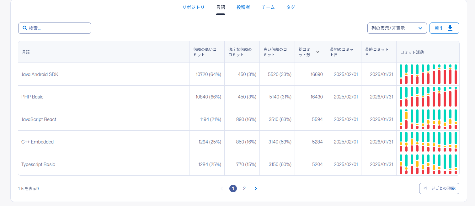 このセクションでは、プログラミング言語別の Trust Agent メトリクスを提供します。このビューを「コミット活動」または「コミット合計」列でソートして、どの言語が最も活発に使用されているかを確認することは、しばしば役に立ちます。