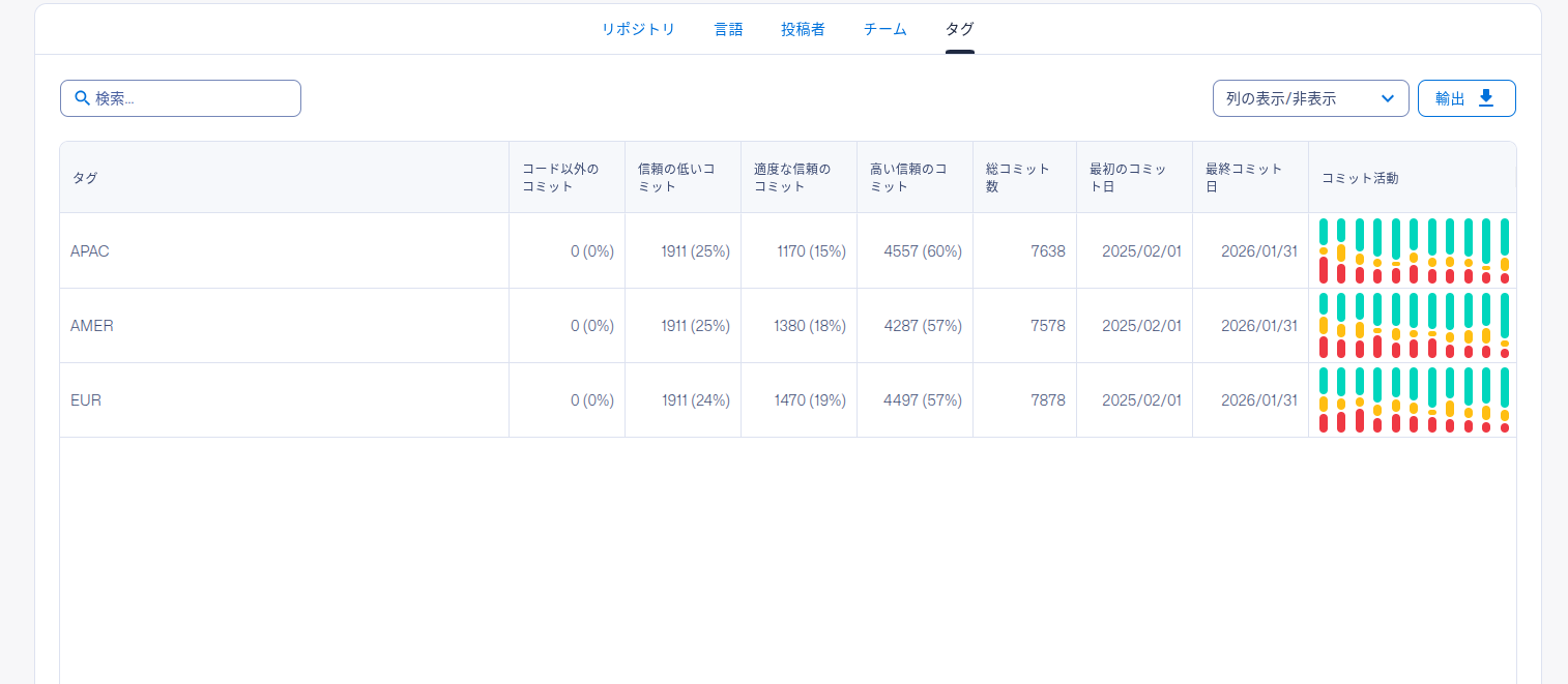 目標とするトレーニングのニーズを特定します: 特定のタグで、信頼度の低い、または中程度のコミットの割合が高い場合は、そのタグに関連する貢献者に合わせたトレーニングプログラムを構成する必要があることを示している可能性があります。